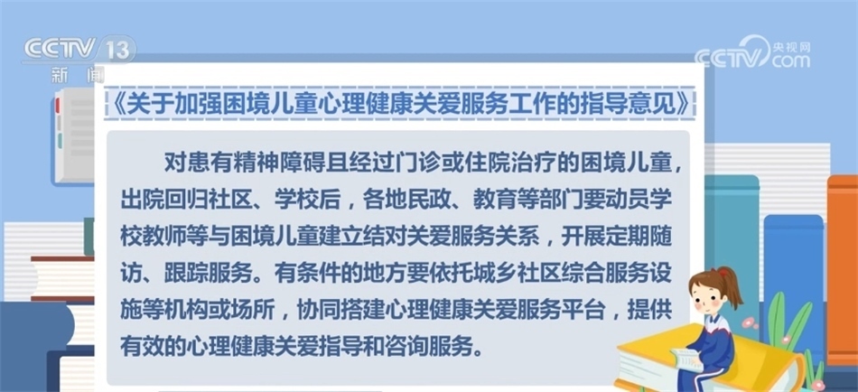 央視網(wǎng)消息:近日,民政部等五部門聯(lián)合印發(fā)《關(guān)于加強(qiáng)困境兒童心理健康關(guān)愛服務(wù)工作的指導(dǎo)意見》,通過加強(qiáng)心理健康教育、開展心理健康監(jiān)測(cè)等措施,全面提升困境兒童心理健康水平和身心健康素質(zhì)。