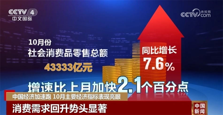 央視網(wǎng)消息:來關注中國經(jīng)濟10月報。國家統(tǒng)計局昨天(11月15日)發(fā)布了10月份經(jīng)濟主要指標。數(shù)據(jù)顯示,隨著宏觀調(diào)控政策持續(xù)發(fā)力顯效,全國生產(chǎn)供給穩(wěn)中有升,市場需求持續(xù)改善,就業(yè)物價總體穩(wěn)定,高質(zhì)量發(fā)展扎實推進,國民經(jīng)濟持續(xù)恢復向好。