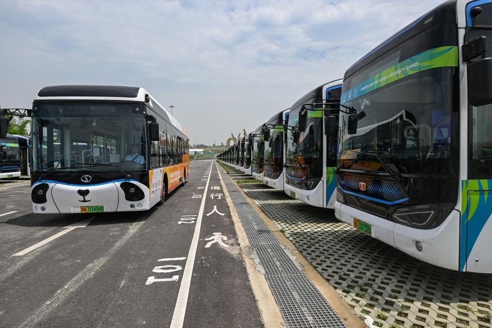 這是負(fù)責(zé)成都第31屆世界大學(xué)生夏季運(yùn)動(dòng)會(huì)交通保障的新能源公交車(chē)。新華社記者王曦 攝