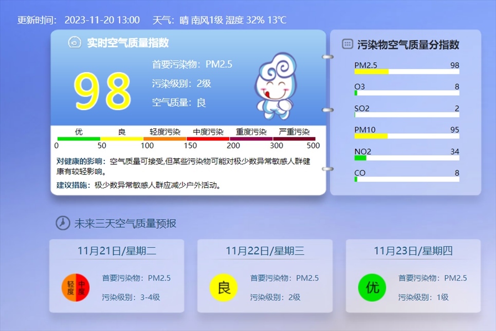 央視網(wǎng)消息:據(jù)@北京環(huán)境監(jiān)測 消息,11月20日13時的實時空氣質(zhì)量指數(shù),北京目前的污染級別達(dá)到2級,東城、西城、朝陽、豐臺、通州、房山、大興等區(qū)已顯示為輕度污染。