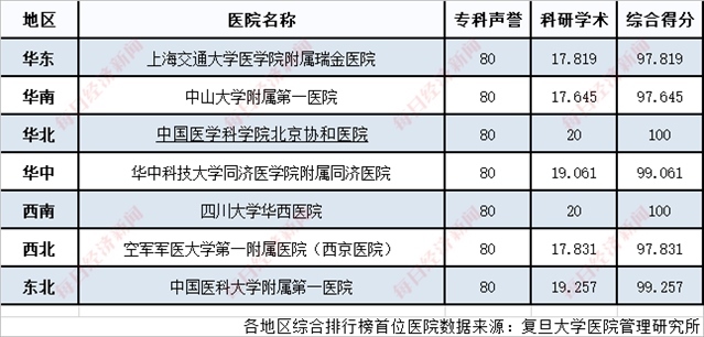 分地區(qū)看,中國醫(yī)學(xué)科學(xué)院北京協(xié)和醫(yī)院和四川大學(xué)華西醫(yī)院分別以專科聲譽(yù)(80)、科研學(xué)術(shù)(20)雙滿分的成績領(lǐng)跑華北地區(qū)、西南地區(qū)的綜合排行榜,中國醫(yī)科大學(xué)附屬第一醫(yī)院和華中科技大學(xué)同濟(jì)醫(yī)學(xué)院附屬同濟(jì)醫(yī)院則分別以99.257和99.061的成績領(lǐng)跑東北地區(qū)和華中地區(qū)。此外,上海交通大學(xué)醫(yī)學(xué)院附屬瑞金醫(yī)院、中山大學(xué)附屬第一醫(yī)院、空軍軍醫(yī)大學(xué)第一附屬醫(yī)院(西京醫(yī)院)也分別在各地區(qū)的綜合排行榜中位列首位。