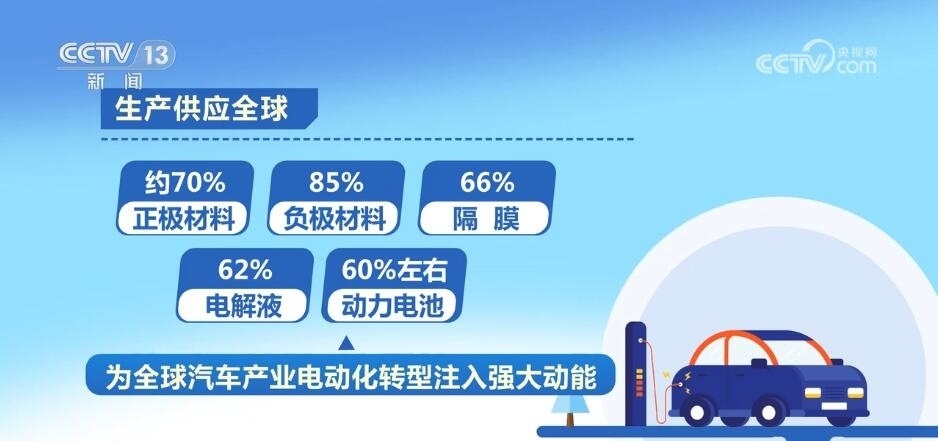 工業(yè)和信息化部表示,我國已建立了結(jié)構(gòu)完整、有機協(xié)同的新能源汽車產(chǎn)業(yè)鏈、供應鏈體系,涵蓋基礎材料、零部件、整車、制造裝備等全鏈條,生產(chǎn)供應了全球約70%的正極材料、85%的負極材料、66%的隔膜、62%的電解液以及60%左右的動力電池,為全球汽車產(chǎn)業(yè)電動化轉(zhuǎn)型注入了強大動能。