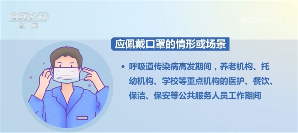 《指引》明確,應(yīng)佩戴口罩的情形或場景包括:新冠病毒感染、流感、肺炎支原體感染、呼吸道合胞病毒感染等呼吸道傳染病感染者前往室內(nèi)公共場所或與他人近距離接觸時。出現(xiàn)發(fā)熱、咳嗽、流涕、咽痛、肌肉酸痛、乏力等呼吸道傳染病癥狀者前往室內(nèi)公共場所或與他人近距離接觸時。前往醫(yī)療機構(gòu)就診、陪診、陪護、探視時。呼吸道傳染病高發(fā)期間,外來人員進入養(yǎng)老機構(gòu)、社會福利機構(gòu)、托幼機構(gòu)等脆弱人群集中場所時。呼吸道傳染病高發(fā)期間,養(yǎng)老機構(gòu)、托幼機構(gòu)、學(xué)校等重點機構(gòu)的醫(yī)護、餐飲、保潔、保安等公共服務(wù)人員工作期間。