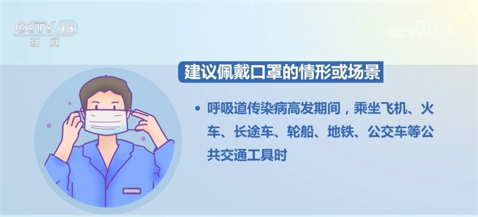 建議佩戴口罩的情形或場景包括:呼吸道傳染病高發(fā)期間,乘坐飛機、火車、長途車、輪船、地鐵、公交車等公共交通工具時。呼吸道傳染病高發(fā)期間,進入超市、影劇院、客運場站、廂式電梯等環(huán)境密閉、人員密集場所時。呼吸道傳染病高發(fā)期間,老年人、慢性基礎(chǔ)疾病患者、孕婦等前往室內(nèi)公共場所時。與出現(xiàn)呼吸道傳染病癥狀者共同學(xué)習(xí)、生活或工作期間。