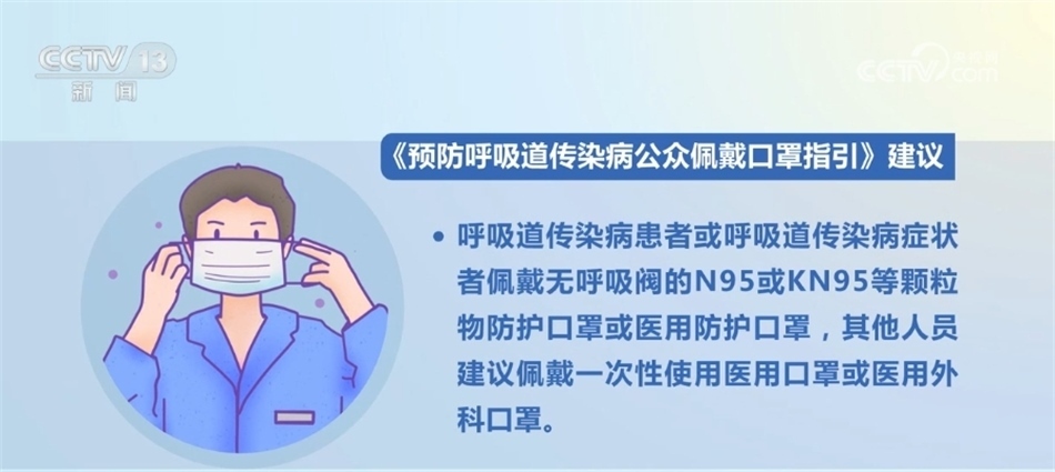 《指引》建議,呼吸道傳染病患者或呼吸道傳染病癥狀者佩戴無呼吸閥的N95或KN95等顆粒物防護口罩或醫(yī)用防護口罩,其他人員建議佩戴一次性使用醫(yī)用口罩或醫(yī)用外科口罩。心肺功能障礙患者應(yīng)在醫(yī)生指導(dǎo)下佩戴口罩。兒童呼吸道傳染病患者或呼吸道傳染病癥狀者建議選用兒童防護口罩,其他兒童建議選用兒童衛(wèi)生口罩。