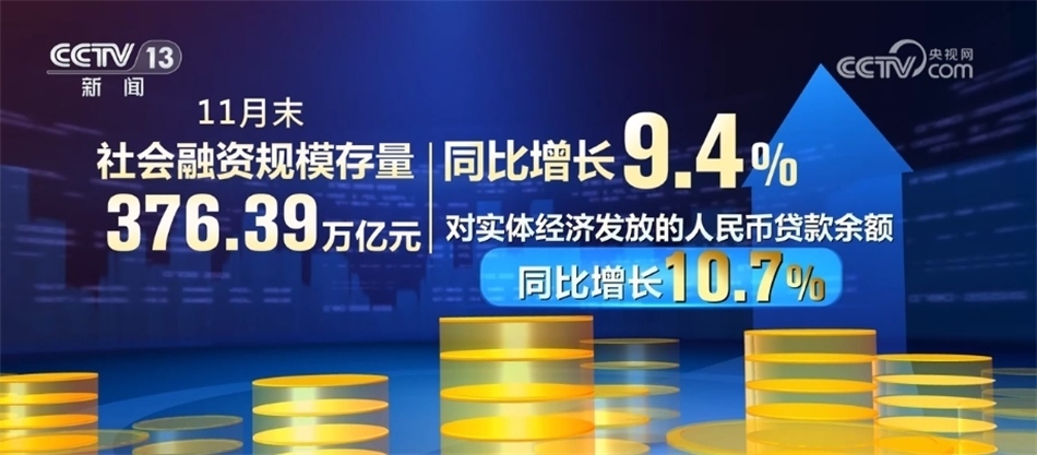 11月末社會(huì)融資規(guī)模存量為376.39萬億元,同比增長9.4%。其中,對實(shí)體經(jīng)濟(jì)發(fā)放的人民幣貸款余額同比增長10.7%。11月份社會(huì)融資規(guī)模增量為2.45萬億元,比上年同期多4556億元。