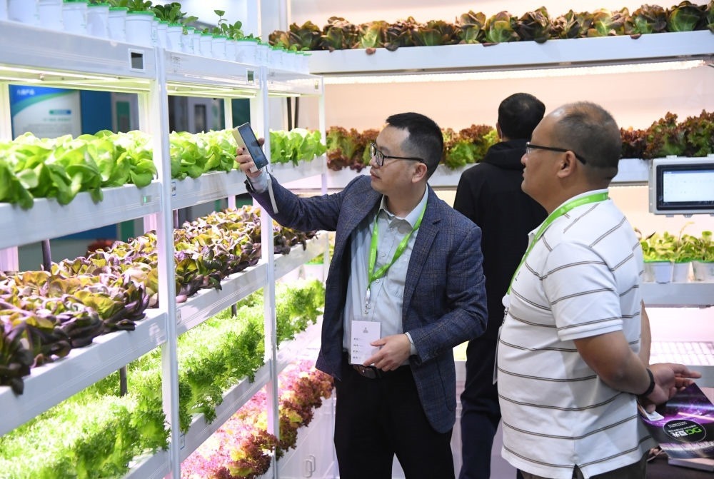 2023世界農業(yè)科技創(chuàng)新大會11月2日至4日在北京舉行。這是2023年11月2日,工作人員(左)在世界農業(yè)科技博覽會現場介紹智慧植物工廠。新華社記者 任超 攝