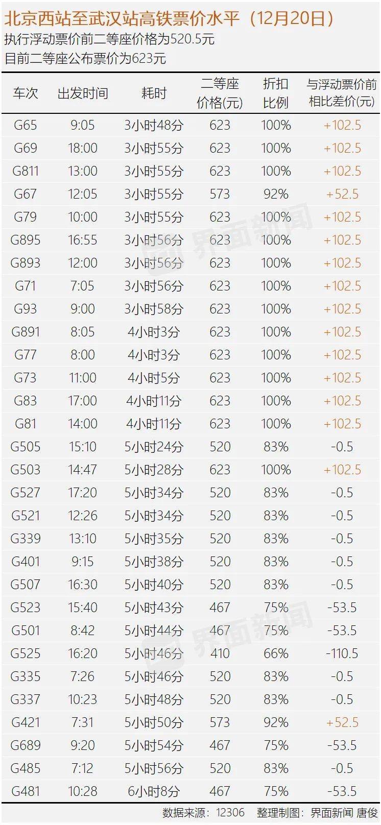 根據(jù)界面新聞統(tǒng)計,12月20日,北京西站至武漢站共有30趟高鐵開行,其中16趟列車與原來相比票價上漲,14趟列車票價下降。票價上漲的列車中,大部分按照最高的公布票價定價,相當(dāng)于上漲了102.5元;票價下降的列車中,只有少數(shù)列車降低了50多元。