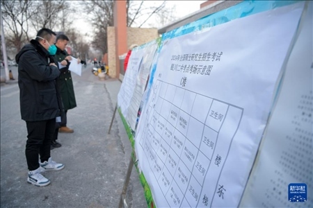 12月23日,考生在寧夏銀川市第二中學(xué)考點(diǎn)外查看考場(chǎng)分布圖。