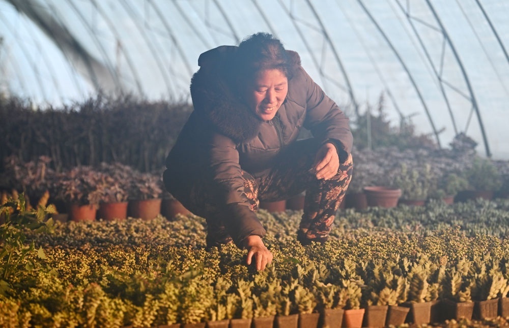 在天津市北辰區(qū)雙口鎮(zhèn)中河頭村,農(nóng)戶正查看大棚里的多肉植物。新華社記者 李然 攝