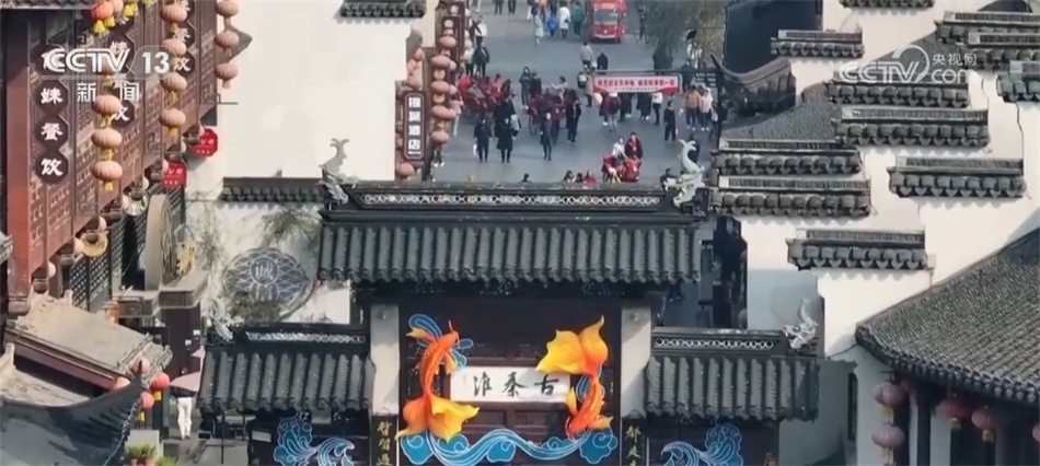 ??????新年將至,南京秦淮河畔的各式花燈陸續(xù)落成,與古建筑相互映襯。碧水繞城,畫(huà)舫穿行,裝扮后的古城如畫(huà)如詩(shī)。在“古秦淮”的牌坊上,魚(yú)躍龍門(mén)的造型立體生動(dòng)。人們穿過(guò)牌坊,采買(mǎi)年貨,拍照留念。在夫子廟南側(cè)的門(mén)東歷史文化街區(qū),一條大龍?jiān)煨偷幕粢莱菈Χ?。十二生肖燈組活靈活現(xiàn),讓古樸的街巷增添了迎新的色彩。
