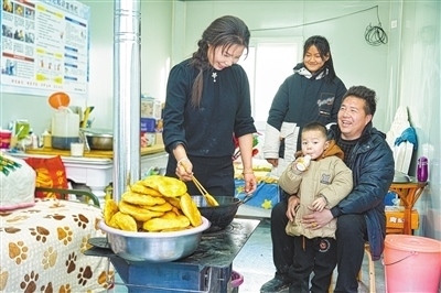 1月3日,王春梅(左一)在安置房里炸油餅。本報記者 賀勇攝