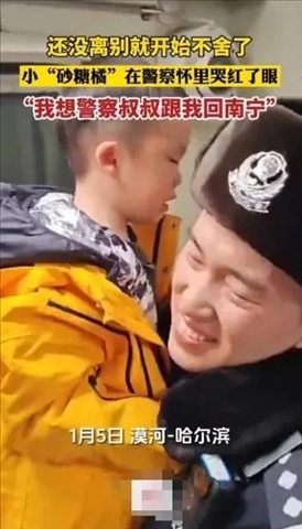 1月5日,從漠河回哈爾濱的雪國(guó)列車上,有位“砂糖橘殿下”邊哭邊抱著警察叔叔不撒手,“我想警察叔叔跟我回南寧?!眮?lái)自東北警察叔叔的愛,一定是最最暖的吧!