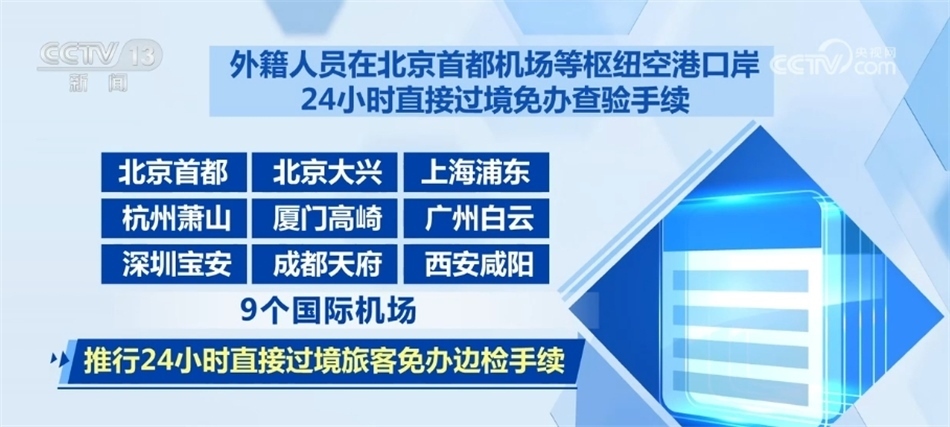 外籍人員在北京首都機(jī)場(chǎng)等樞紐空港口岸24小時(shí)直接過(guò)境免辦查驗(yàn)手續(xù)。在北京首都、北京大興、上海浦東、杭州蕭山、廈門高崎、廣州白云、深圳寶安、成都天府、西安咸陽(yáng)9個(gè)國(guó)際機(jī)場(chǎng),推行24小時(shí)直接過(guò)境旅客免辦邊檢手續(xù)。對(duì)于持24小時(shí)內(nèi)國(guó)際聯(lián)程機(jī)票,經(jīng)上述任一機(jī)場(chǎng)過(guò)境前往第三國(guó)或地區(qū)的出入境旅客,可以免辦邊檢手續(xù),直接免簽過(guò)境。