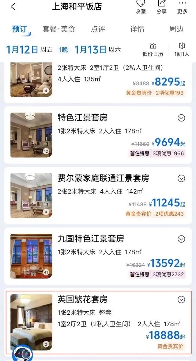 劇中出鏡率極高的和平飯店英國(guó)套房也成了“熱門(mén)產(chǎn)品”。目前,和平飯店英國(guó)套房在旅游平臺(tái)上被命名為“英國(guó)繁花套房”。9日查詢攜程旅行平臺(tái)發(fā)現(xiàn),9-11日該套房已售罄,12日入住一晚的價(jià)格為18888元。據(jù)媒體此前報(bào)道,這一套房在今年春節(jié)期間含早價(jià)為22888元一晚。