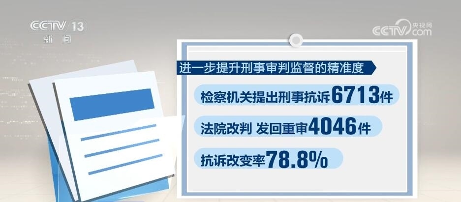 進(jìn)一步提升刑事審判監(jiān)督的精準(zhǔn)度,檢察機關(guān)提出刑事抗訴6713件,法院改判、發(fā)回重審4046件,抗訴改變率78.8%。同時,檢察機關(guān)深化“派駐+巡回”檢察工作,對不當(dāng)減刑、假釋、暫予監(jiān)外執(zhí)行共提出糾正意見1.8萬人。