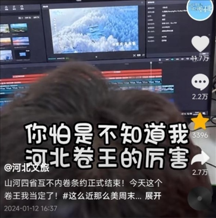 有網(wǎng)友建議賬號(hào)改名為“河北文旅”,“不然都搜不到”,“聽(tīng)勸”的官方賬號(hào)火速改名,并發(fā)布視頻“宣戰(zhàn)”,“山河四省互不內(nèi)卷?xiàng)l約正式結(jié)束,今天這個(gè)卷王我當(dāng)定了”,于是開(kāi)始“瘋狂輸出”,日更75條,可還了得?