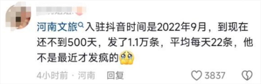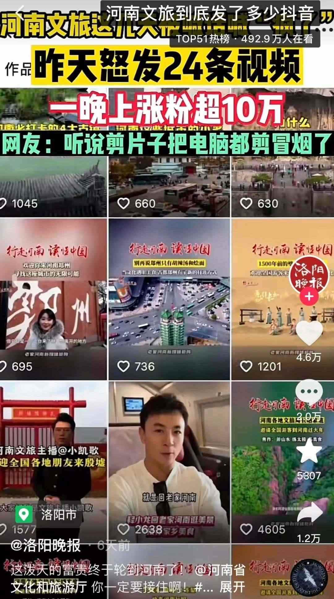 有人統(tǒng)計(jì),自1月9日起,河南文旅官方賬號(hào)“河南省文化和旅游廳”每天發(fā)布二三十條視頻,連續(xù)四天發(fā)布了112條視頻,持續(xù)展示本地文旅資源,吸引了近百萬(wàn)新粉絲,主打一個(gè)“量變總會(huì)引起質(zhì)變”,以至于“河南文旅到底發(fā)了多少抖音”相關(guān)話題成為熱門(mén)搜索。