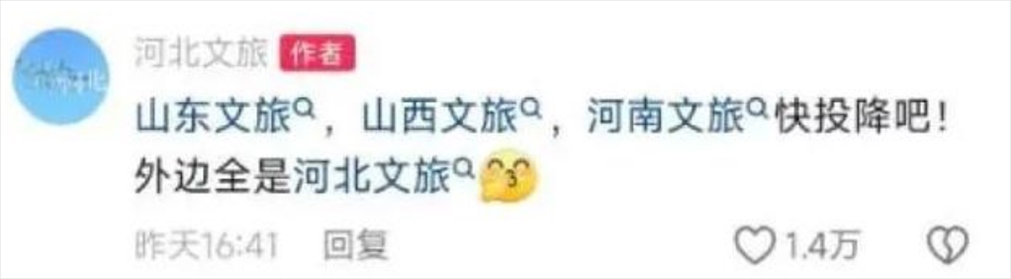 此前,山西、河南宣布結(jié)成“旅游搭子”,豫晉六城114家A級(jí)景區(qū)門(mén)票互免,見(jiàn)河南文旅“悄悄努力驚艷所有人”,山西文旅“醋壇子立馬打翻了”,直接喊麥……