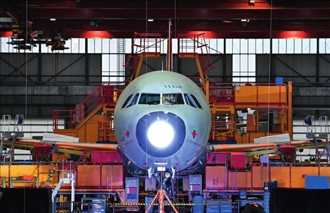 空客天津總裝線的首架空客A321飛機(jī)上線總裝(2022年11月9日攝) 趙子碩攝/本刊