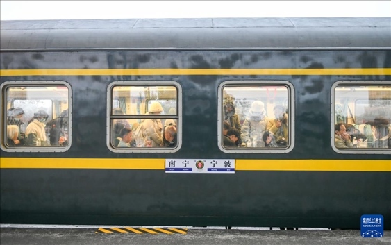 1月26日,在湖南省永州市道縣道州站,乘客在T582次列車(chē)上等候發(fā)車(chē)。新華社發(fā)(蔣克青攝)