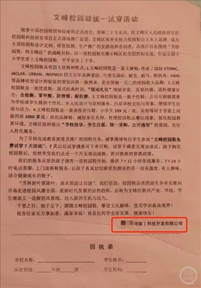 ·無工商登記的科技公司在河南安陽推廣校園鞋,159元一雙,教育局:“是有校園鞋試穿活動(dòng),對(duì)公司情況不清楚?!鄙媸鹿荆汗久謱戝e(cuò)了。