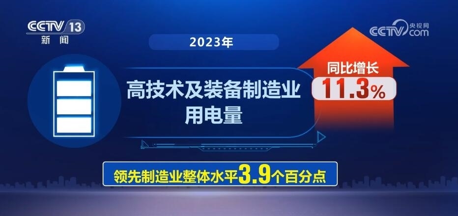 來自中國電力企業(yè)聯(lián)合會數(shù)據(jù)顯示,2023年,高技術(shù)及裝備制造業(yè)用電量同比增長11.3%,領(lǐng)先制造業(yè)整體水平3.9個百分點。