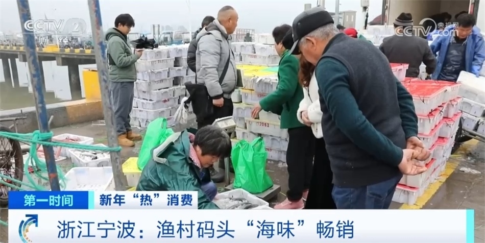 浙江寧波奉化區(qū)莼湖街道的漁村碼頭也進(jìn)入了年前最后的繁忙時(shí)刻。上午八點(diǎn),5艘運(yùn)輸船??吭趦?nèi)外碼頭上,據(jù)了解,一艘運(yùn)輸船有七八千箱漁獲物,近八成是帶魚(yú)。最近每天有百萬(wàn)斤東海魚(yú)貨就地銷(xiāo)售或運(yùn)往全國(guó)各地,預(yù)計(jì)將持續(xù)至臘月二十七。在碼頭邊桐照魚(yú)市場(chǎng)的攤位上,色澤鮮亮的帶魚(yú)、鯧魚(yú)、大黃魚(yú)等海產(chǎn)品琳瑯滿目,市民們忙著挑選,漁商們則賣(mài)力吆喝著。