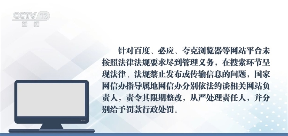 針對百度、必應(yīng)、夸克瀏覽器等網(wǎng)站平臺未按照法律法規(guī)要求盡到管理義務(wù),在搜索環(huán)節(jié)呈現(xiàn)法律、法規(guī)禁止發(fā)布或傳輸?shù)男畔栴},國家網(wǎng)信辦指導(dǎo)屬地網(wǎng)信辦分別依法約談相關(guān)網(wǎng)站負責人,責令其限期整改,從嚴處理責任人,并分別給予罰款行政處罰。