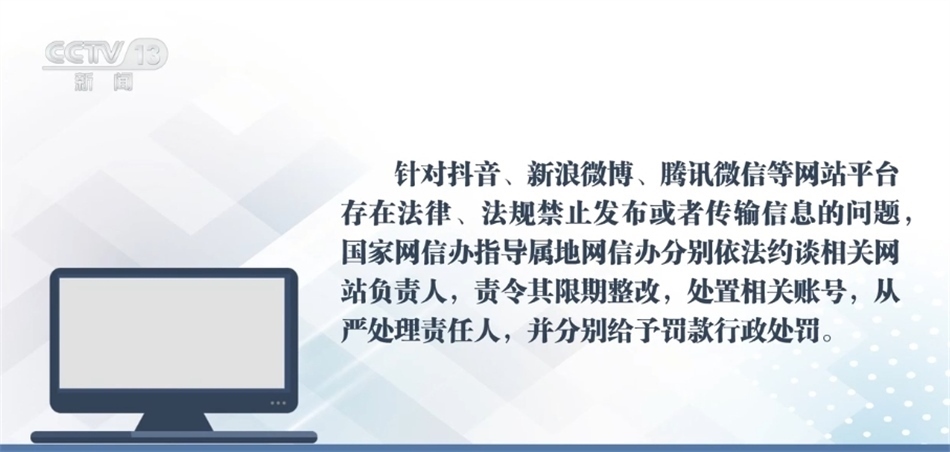 針對抖音、新浪微博、騰訊微信等網(wǎng)站平臺存在法律、法規(guī)禁止發(fā)布或者傳輸信息的問題,國家網(wǎng)信辦指導(dǎo)屬地網(wǎng)信辦分別依法約談相關(guān)網(wǎng)站負責人,責令其限期整改,處置相關(guān)賬號,從嚴處理責任人,并分別給予罰款行政處罰。