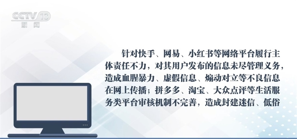 針對快手、網(wǎng)易、小紅書等網(wǎng)絡(luò)平臺履行主體責任不力,對其用戶發(fā)布的信息未盡管理義務(wù),造成血腥暴力、虛假信息、煽動對立等不良信息在網(wǎng)上傳播;拼多多、淘寶、大眾點評等生活服務(wù)類平臺審核機制不完善,造成封建迷信、低俗色情信息在網(wǎng)上傳播等問題,國家網(wǎng)信辦指導(dǎo)屬地網(wǎng)信辦分別依法約談相關(guān)網(wǎng)站負責人,責令其限期整改,處置相關(guān)賬號,從嚴處理責任人,并分別給予警告、罰款等行政處罰。