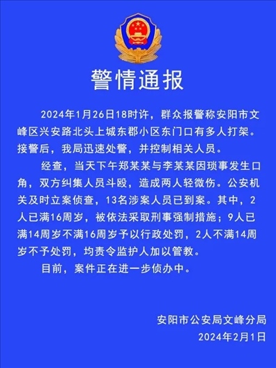 ·河南安陽(yáng)警方通報(bào)一起斗毆案:2人因瑣事?tīng)?zhēng)執(zhí)糾集多人斗毆,13人已到案,其中11人不滿(mǎn)16歲。