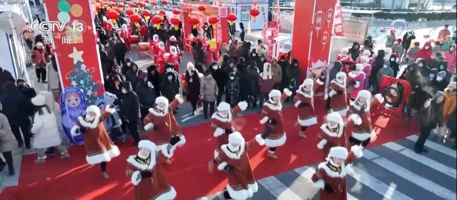 在黑龍江同江市的中俄年貨大集上,不僅有當(dāng)?shù)靥厣膬鲷~、凍梨、凍柿子,還有俄羅斯的大列巴、巧克力等美食。逛吃的同時(shí),現(xiàn)場(chǎng)還能欣賞各具特色的中俄文藝表演,讓趕集的人一飽眼福。
