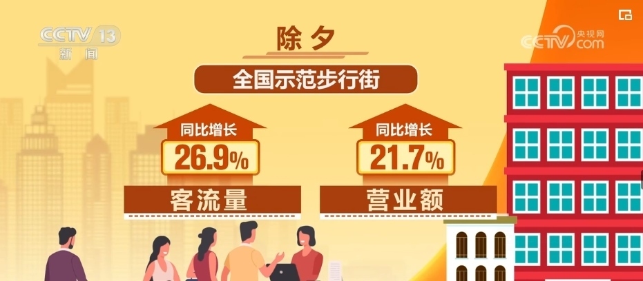 據(jù)商務(wù)部大數(shù)據(jù)監(jiān)測,2024年除夕,部分重點大型超市即時零售銷售額同比增長約20%。除夕當天,重點電商平臺在線餐飲銷售額同比增長40.8%,全國示范步行街客流量、營業(yè)額同比分別增長26.9%和21.7%。