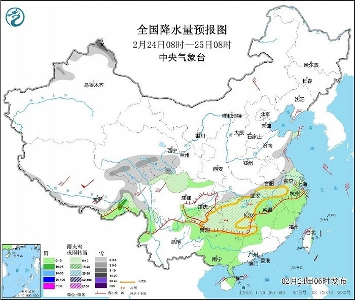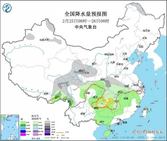 央視網消息:中央氣象臺網站2月24日消息,昨日,河南、安徽、四川等地部分地區(qū)出現了明顯的雨雪天氣,湖北、湖南及貴州部分地區(qū)出現凍雨。近期我國大部地區(qū)氣溫偏低,南方部分地區(qū)有雨雪冰凍天氣,公眾需持續(xù)做好防寒保暖,外出警惕雨雪冰凍天氣造成的路面濕滑,注意交通安全。