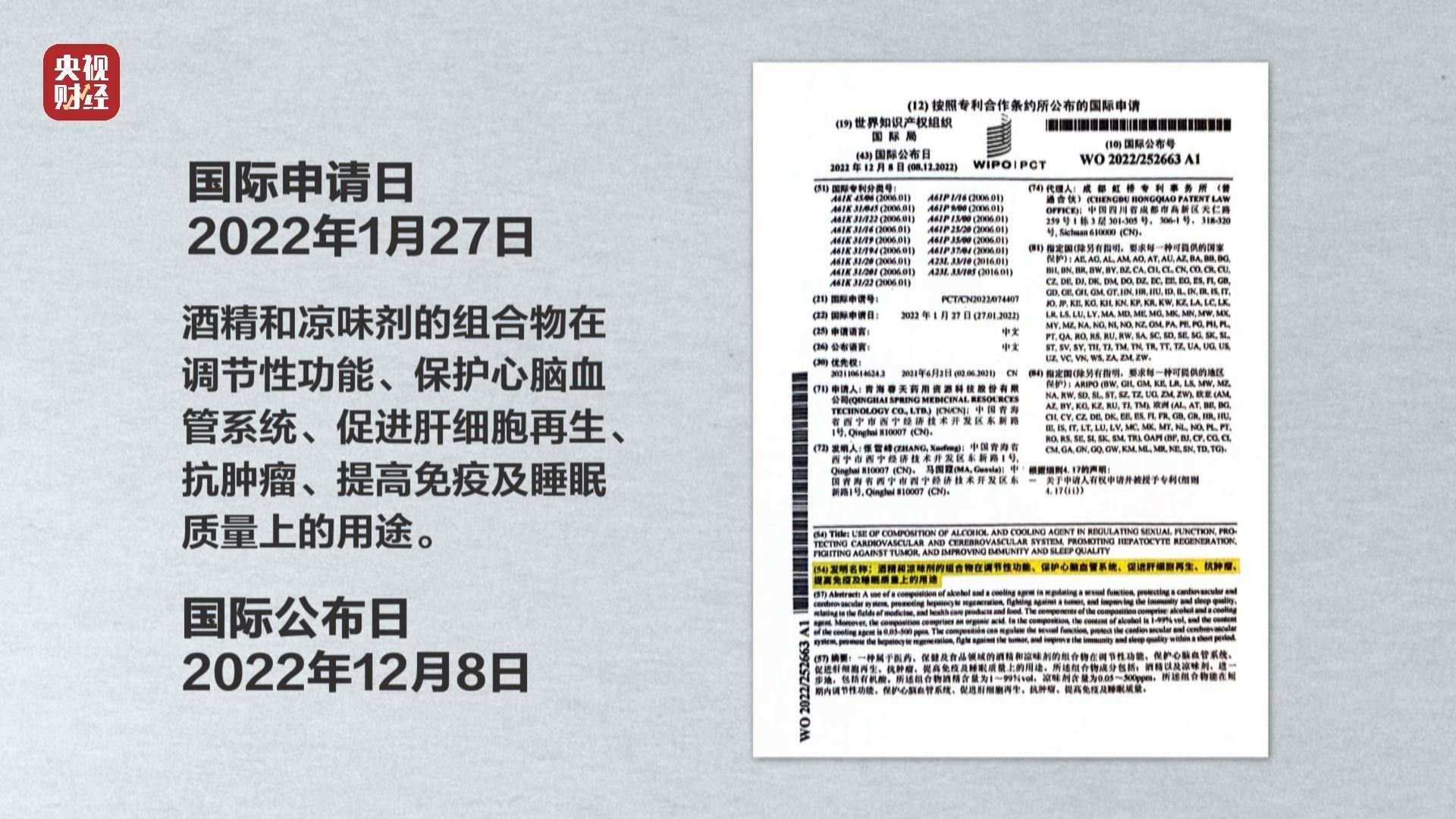 聽(tīng)花酒申請(qǐng)的專利到底是什么?根據(jù)聽(tīng)花酒公開(kāi)資料顯示,2022年1月27日,聽(tīng)花酒申請(qǐng)的國(guó)際專利,名稱為《酒精和涼味劑的組合物在調(diào)節(jié)性功能、保護(hù)心腦血管系統(tǒng)、促進(jìn)肝細(xì)胞再生、抗腫瘤、提高免疫及睡眠質(zhì)量上的用途》,公布日為2022年12月8日。