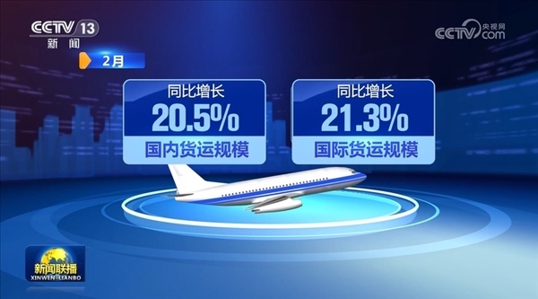 貨運方面,2月,全行業(yè)完成貨郵運輸量54.6萬噸,同比增長20.8%。其中,國內、國際貨運規(guī)模同比分別增長20.5%、21.3%。1—2月貨郵運輸量達到歷年開年前兩月最高值。