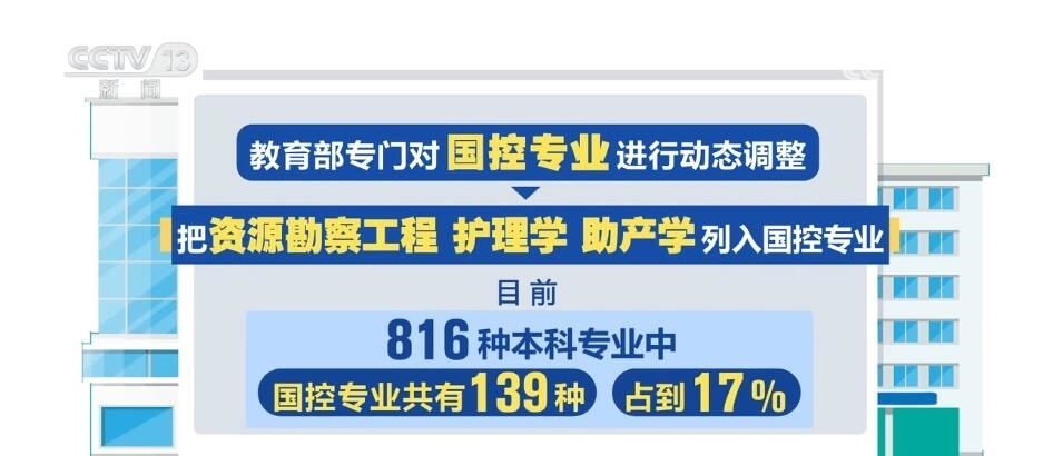 此次教育部專門(mén)對(duì)國(guó)控專業(yè)進(jìn)行了動(dòng)態(tài)調(diào)整,把資源勘察工程、護(hù)理學(xué)、助產(chǎn)學(xué)列入了國(guó)控專業(yè)。目前,816種本科專業(yè)中,國(guó)控專業(yè)共有139種,占到17%。未來(lái),國(guó)控專業(yè)范圍還將進(jìn)行“有進(jìn)有出”的動(dòng)態(tài)調(diào)整。