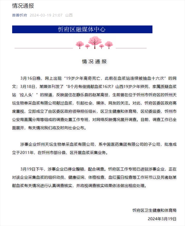 ·山西忻州通報“19歲少年生前被連續(xù)抽血16次”:已展開調(diào)查。