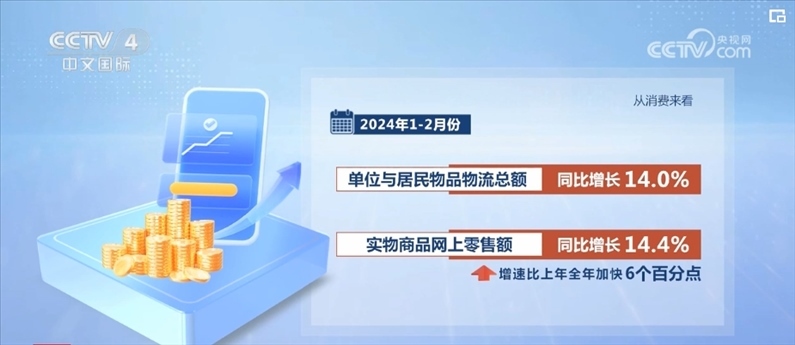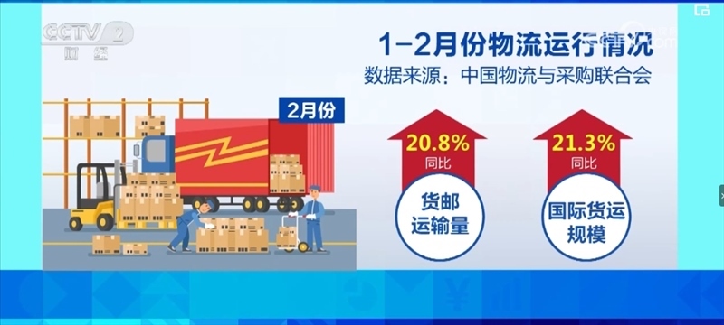 從消費來看,1—2月份,單位與居民物品物流總額同比增長14.0%,實物商品網(wǎng)上零售額同比增長14.4%,增速比上年全年加快6個百分點;快遞業(yè)務(wù)量超過230億件,同比增長28.5%,比上年全年加快9.1個百分點。