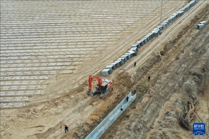 在新疆阿克蘇地區(qū)阿瓦提縣高標(biāo)準(zhǔn)農(nóng)田核心示范區(qū),施工人員在棉田外修建防滲渠(3月27日攝,無(wú)人機(jī)照片)。