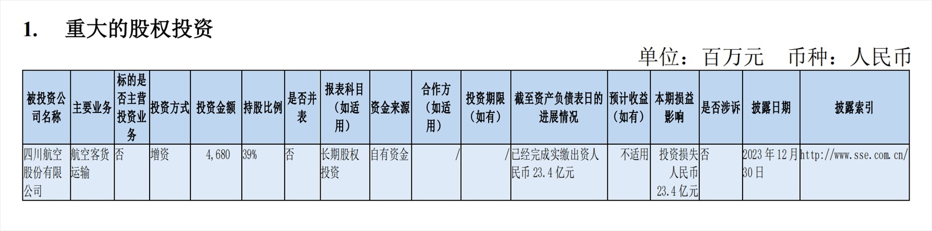 南方航空副董事長、總經(jīng)理韓文勝在3月29日的業(yè)績說明會上也提到,四川航空前期未確認的損失自2021年6月開始形成,截至2023年12月31日增資當(dāng)期,確認虧損23.4億元,尚未確認26.6億元。投資損失產(chǎn)生的原因主要是疫情期間四川航空累計經(jīng)營虧損,超出南航對四川航空的投資成本。