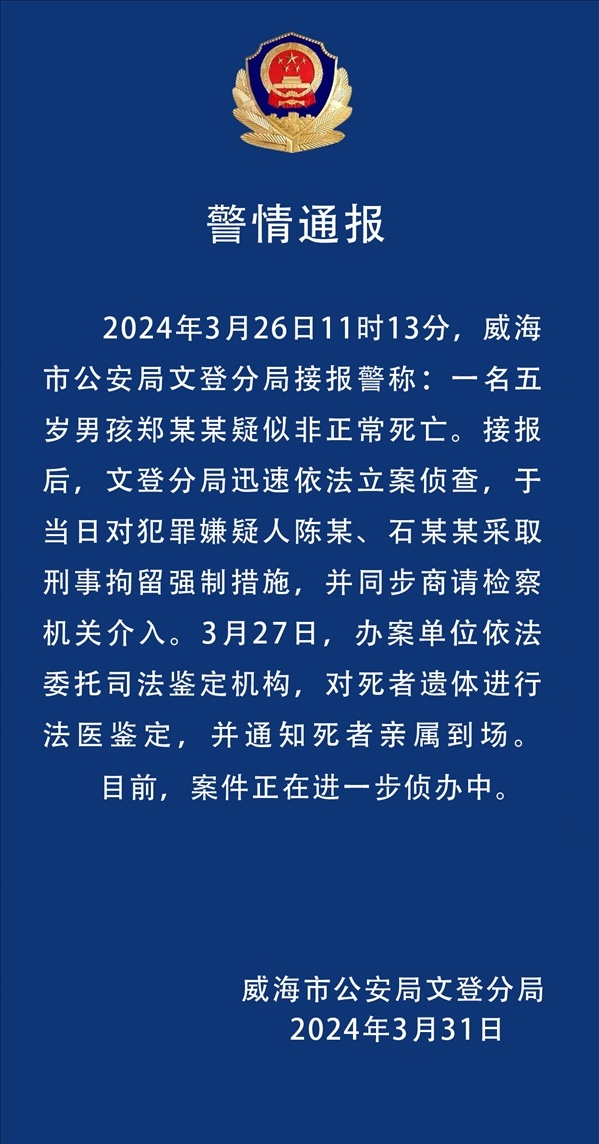 ·山東威海警方通報5歲男童疑被打致死事件:兩名犯罪嫌疑人被刑拘。