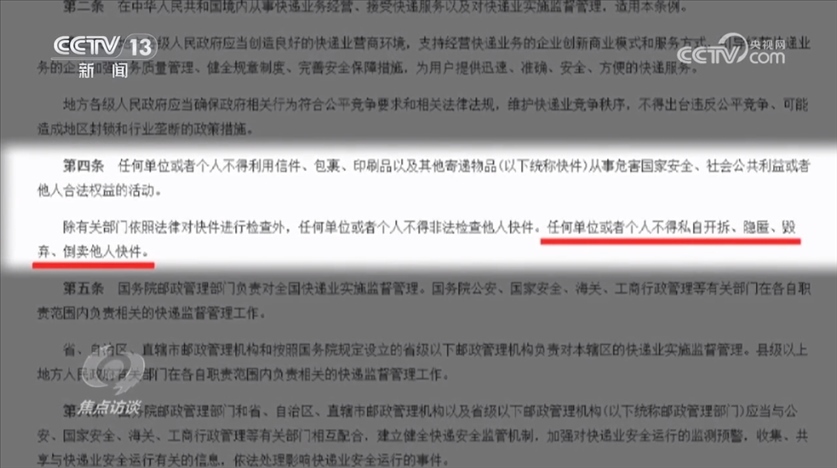 國(guó)務(wù)院頒布的《快遞暫行條例》第四條明確規(guī)定:“任何單位或者個(gè)人不得私自開(kāi)拆、隱匿、毀棄、倒賣他人快件?!?/p>