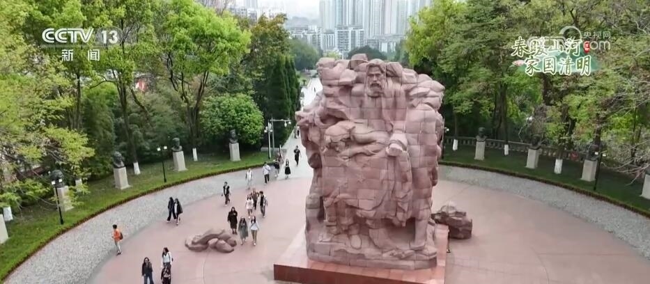 這里是位于重慶市沙坪壩區(qū)的歌樂山烈士陵園。1939年至1949年,以渣滓洞、白公館為主的重慶軍統(tǒng)集中營是國民黨囚禁和屠殺中共黨員、抗日愛國將領、民主人士及其他革命志士的秘密監(jiān)獄。重慶解放后,人民政府將犧牲的300多名英烈遺骸合葬于此,并于1954年建成烈士墓園和烈士紀念碑。在烈士陵園中,聳立著一座由438塊紅色花崗石組成的烈士群雕。人們來到這里獻花祭掃、默哀緬懷,汲取砥礪前行的力量。
