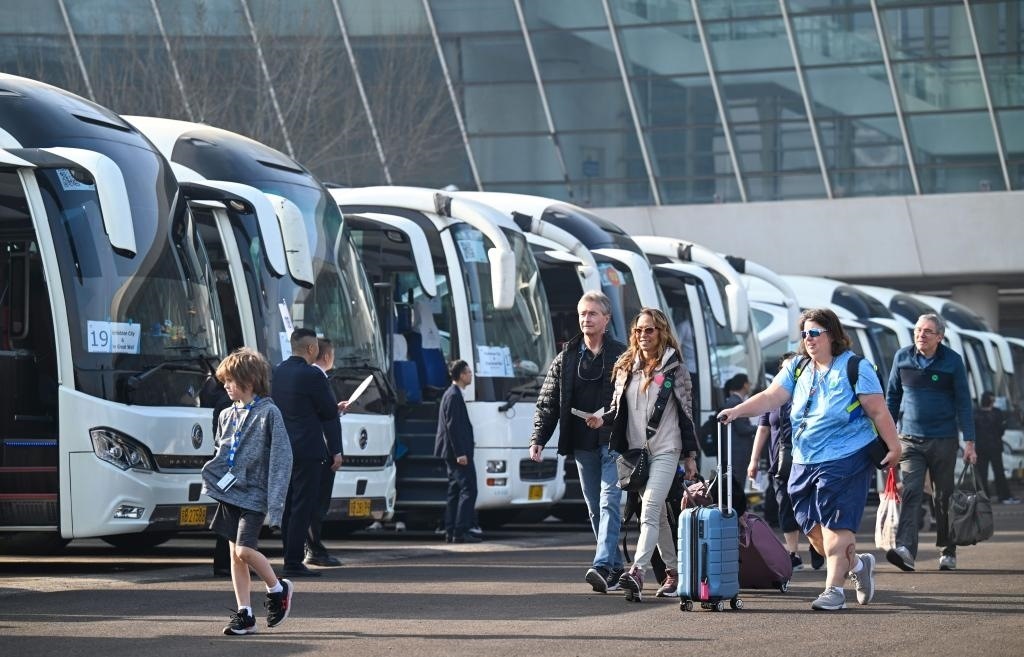4月7日,外籍旅客準備搭乘大巴車前往京津旅游景點。新華社記者 孫凡越 攝