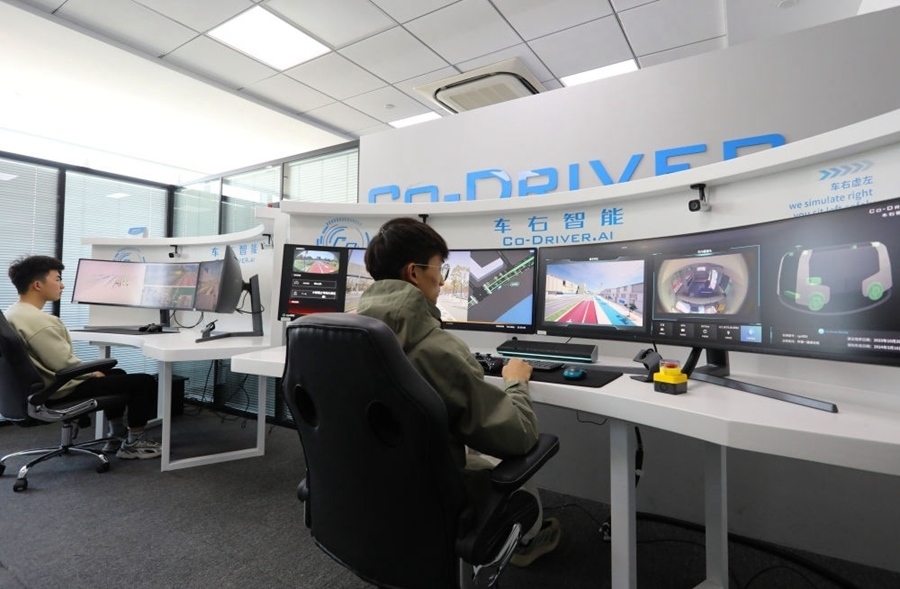 在位于中國(上海)自由貿(mào)易試驗(yàn)區(qū)臨港新片區(qū)的一家智能駕駛企業(yè),工作人員通過無人駕駛汽車遠(yuǎn)程監(jiān)管平臺(tái)的實(shí)時(shí)畫面,結(jié)合電子地圖對(duì)在自動(dòng)駕駛測(cè)試專用路上行駛的車輛進(jìn)行監(jiān)管(2024年4月9日攝)。