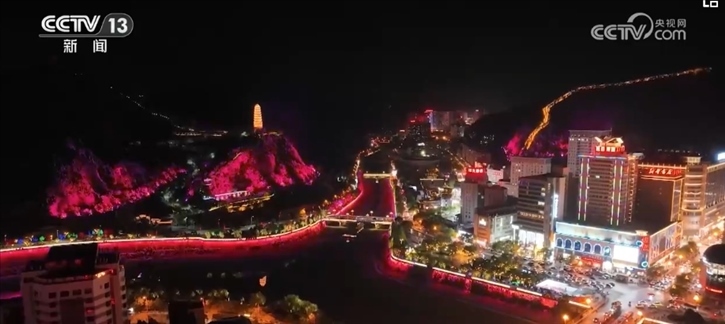 隨著夜幕降臨,寶塔山化身為一幅巨大的畫(huà)布,上演著音樂(lè)燈光秀。聲光合一、三山聯(lián)動(dòng),360度環(huán)繞演繹,生動(dòng)展現(xiàn)了延安的紅色故事和文化特色。