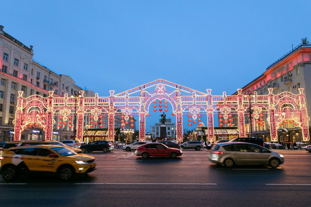 2024年2月9日,在俄羅斯首都莫斯科,車輛在中國(guó)新年主題裝飾前駛過。當(dāng)日,“莫斯科的中國(guó)新年”文化活動(dòng)在俄羅斯首都莫斯科市中心啟動(dòng)。新華社記者 白雪騏 攝