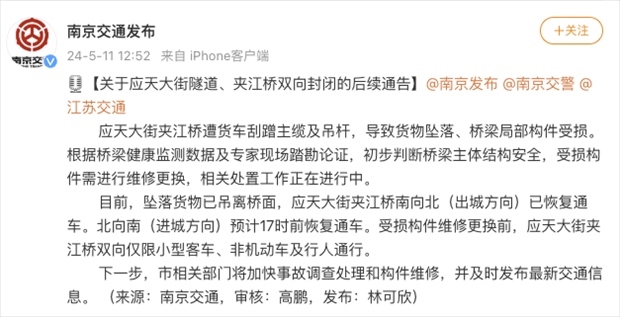 ·南京貨車側翻撞壞夾江大橋?官方通報:初步判斷橋梁主體結構安全。